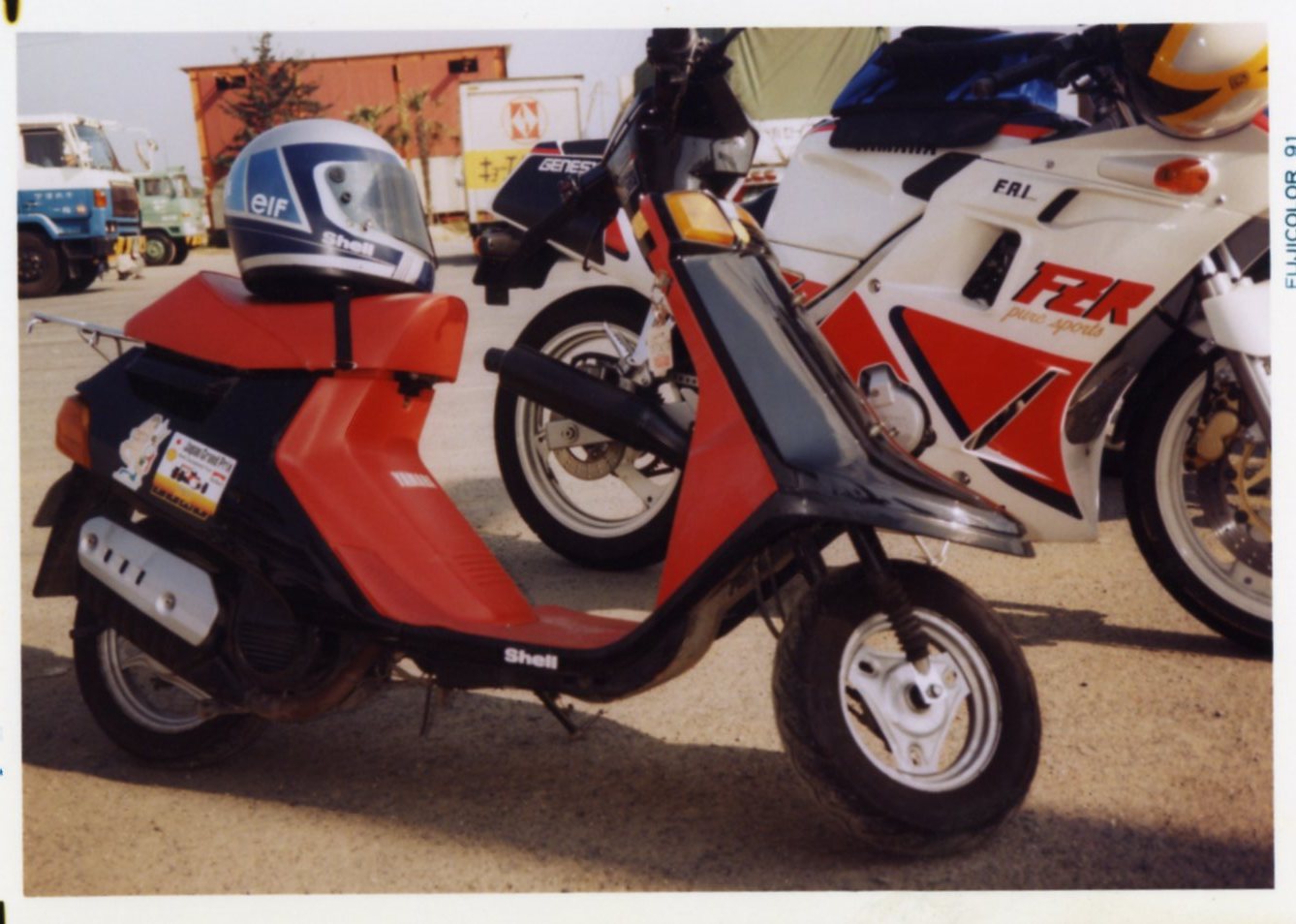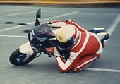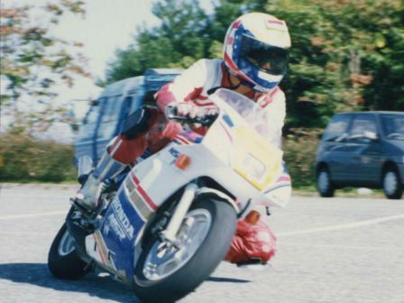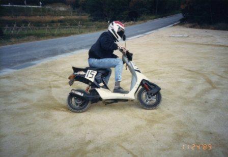 1990年。通学とスクーターレース用に購入。加速が凄いバイクでした。このバイクで膝の代わりに足でグリップする「ハングオン」を覚えました。