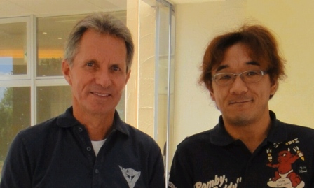 バンクさせる練習をしている風景です。ひざには、空き缶を潰してガムテープで貼り付けています。擦り過ぎると熱いんですよ。 -